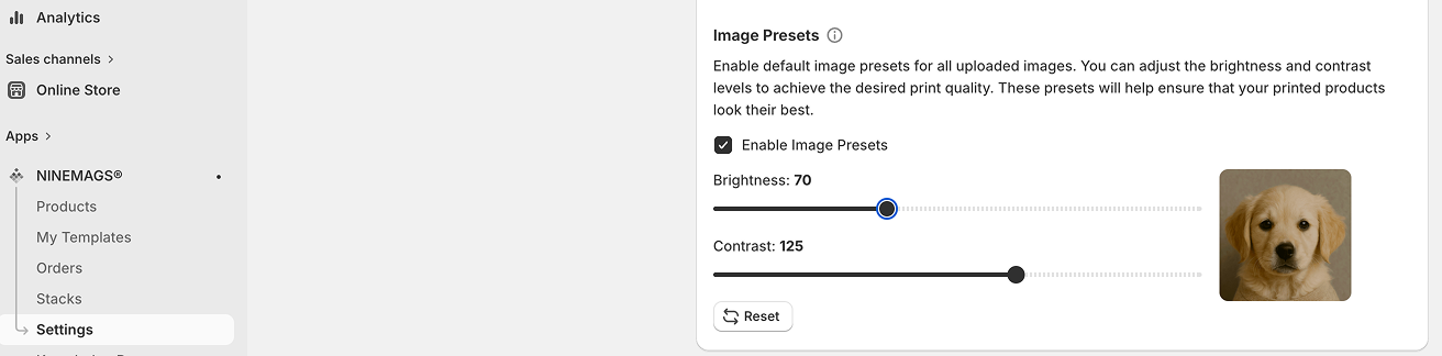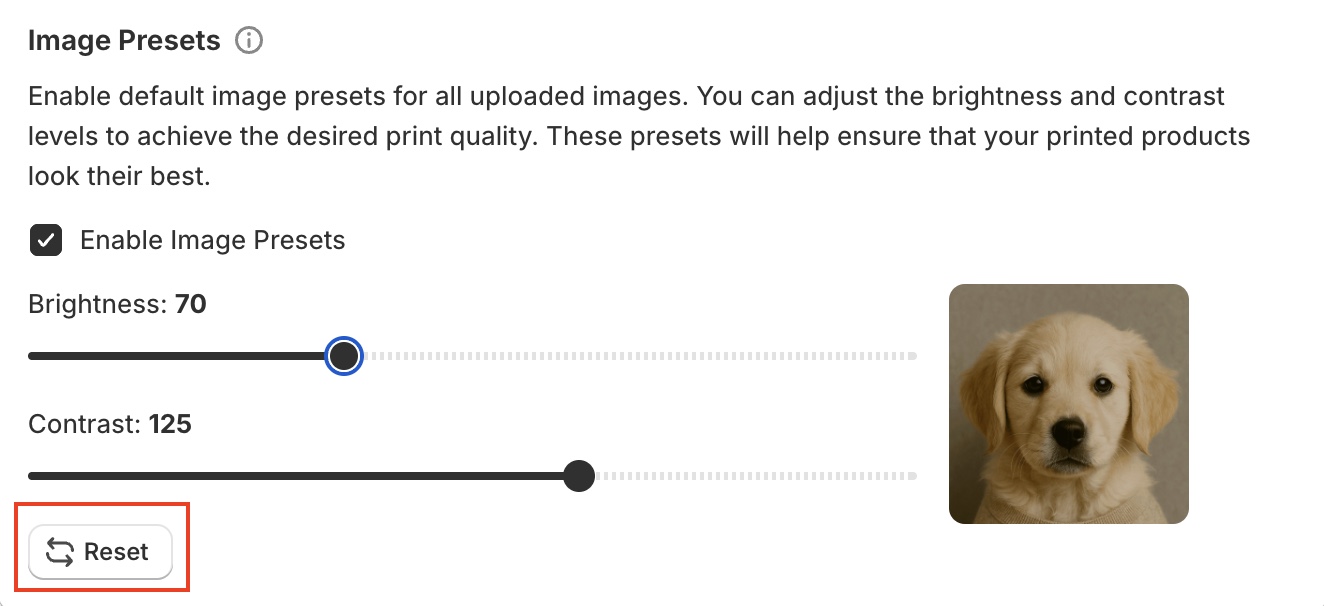 Image Presets allow you to adjust brightness and contrast of images to improve print quality.