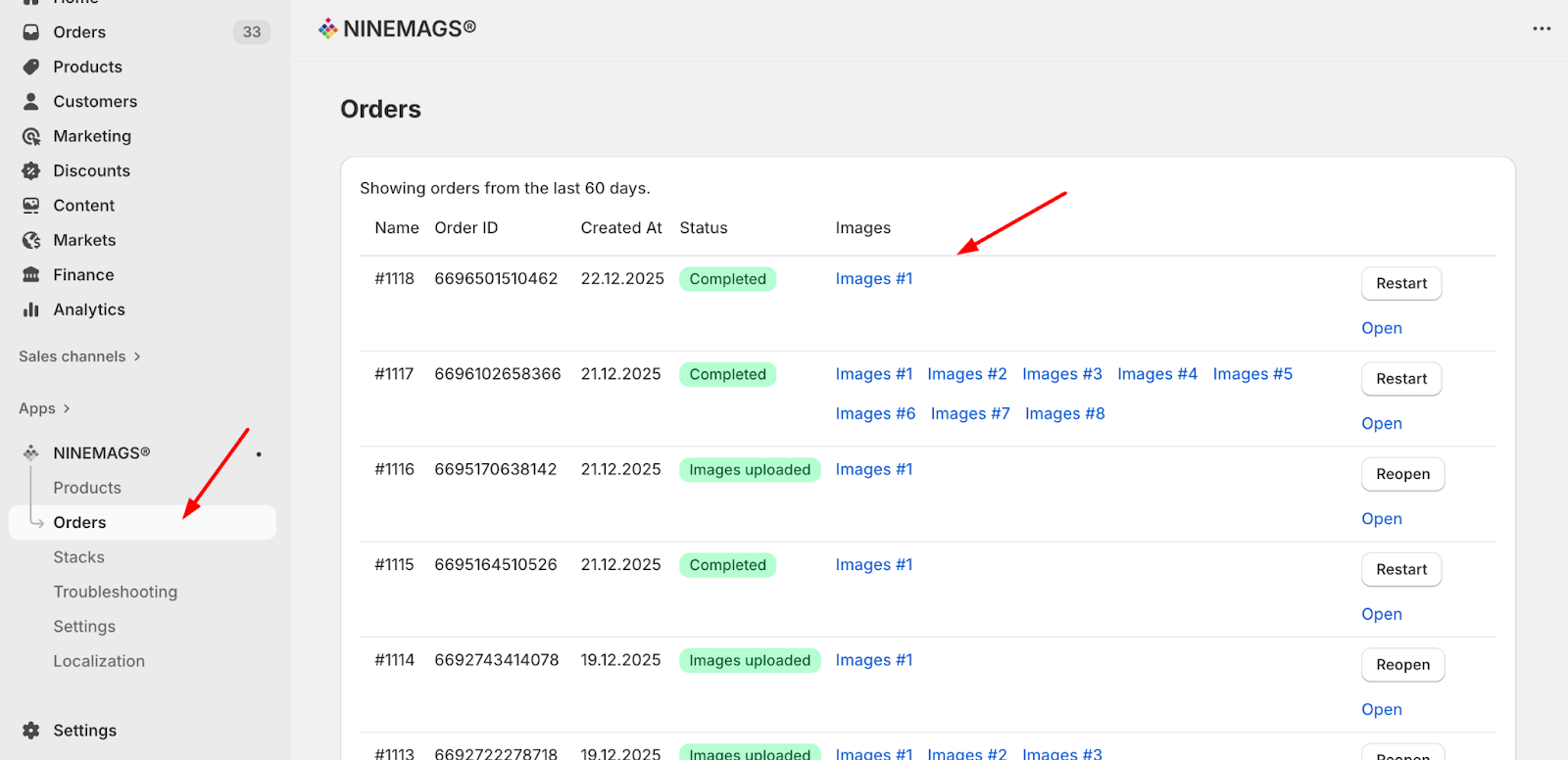 - Open Apps → NINEMAGS → Orders in the Shopify admin.