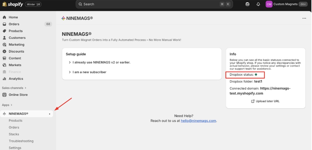 Before NINEMAGS can send order files to Dropbox, make sure the integration is connected correctly.