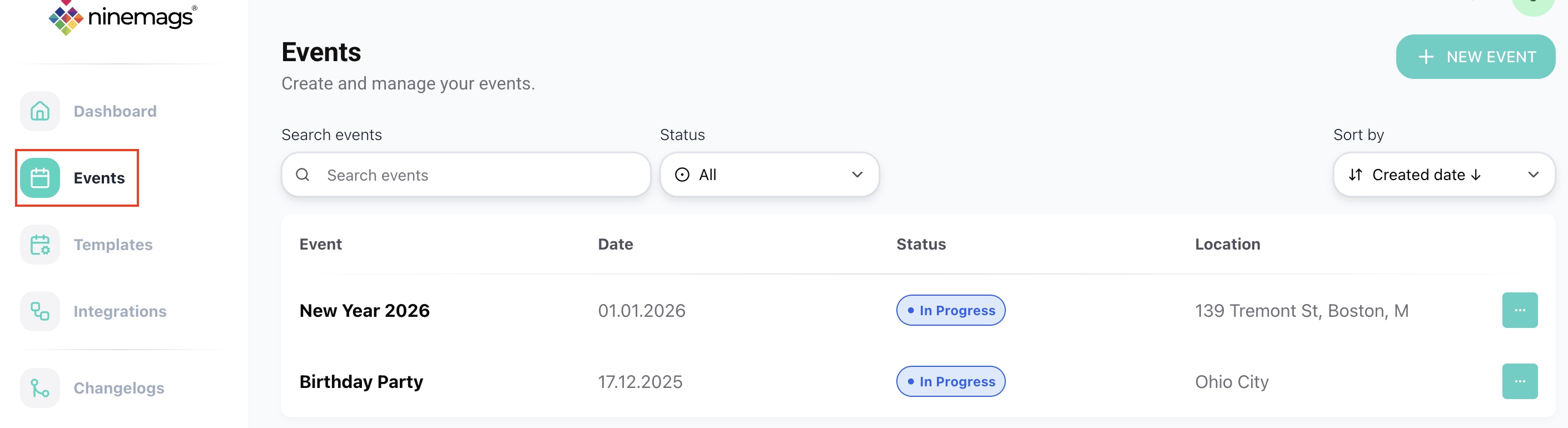 Once the event is created, it will appear in the Events list.